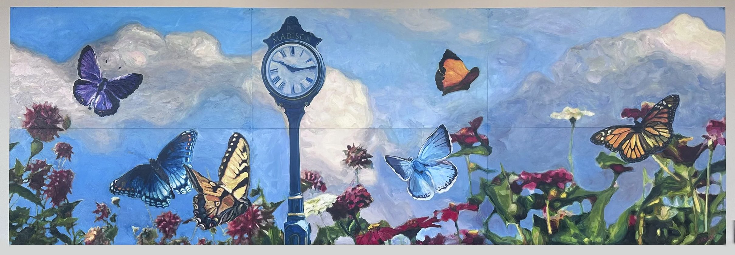 During installation, neighbors stopped to watch the mural take shape, ask questions, and share their own memories of chasing butterflies as children. Designed to be both immersive and uplifting, the mural encourages curiosity, conversation, and care for pollinators — turning an everyday wall into a moment of wonder for the community.